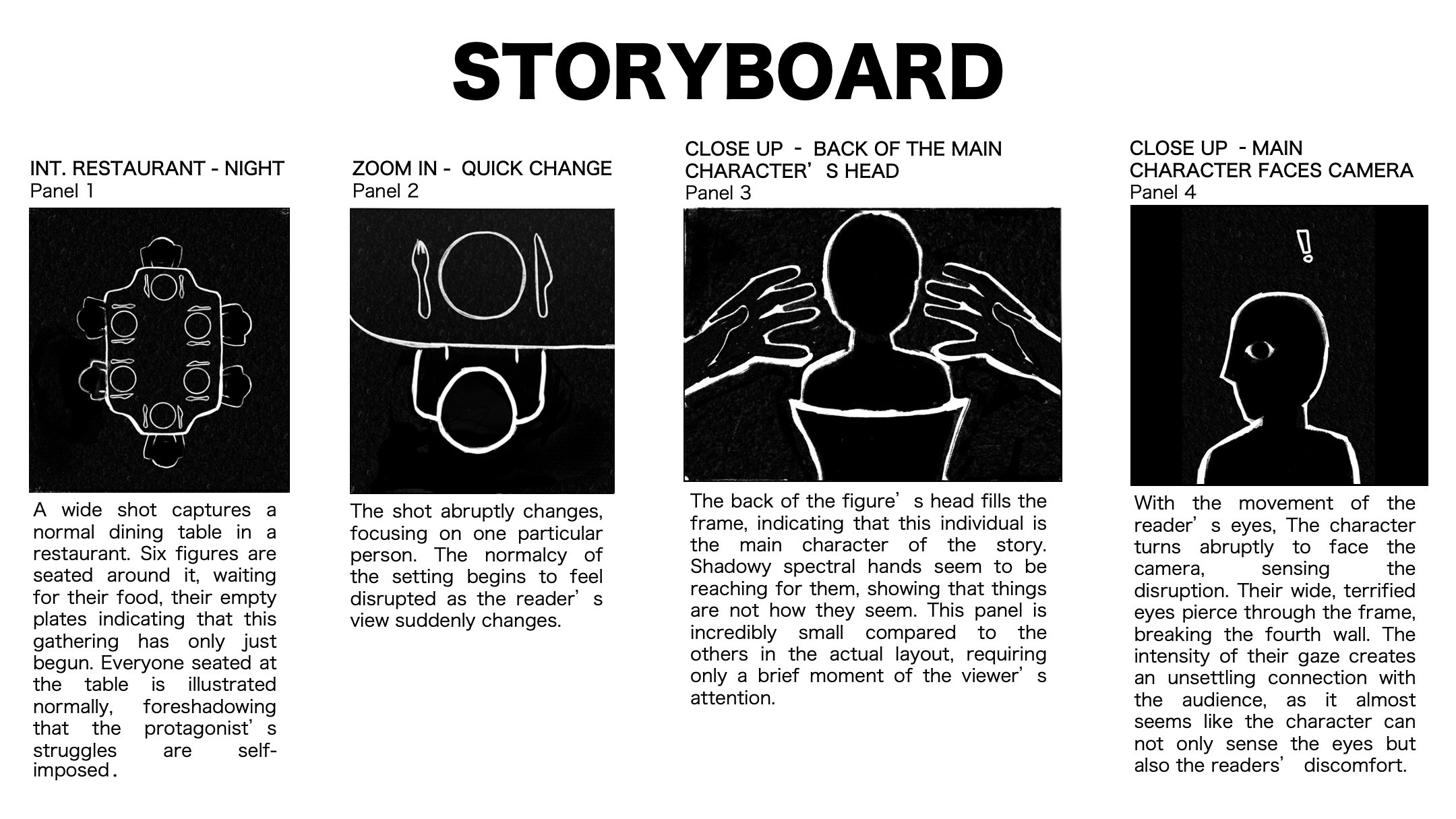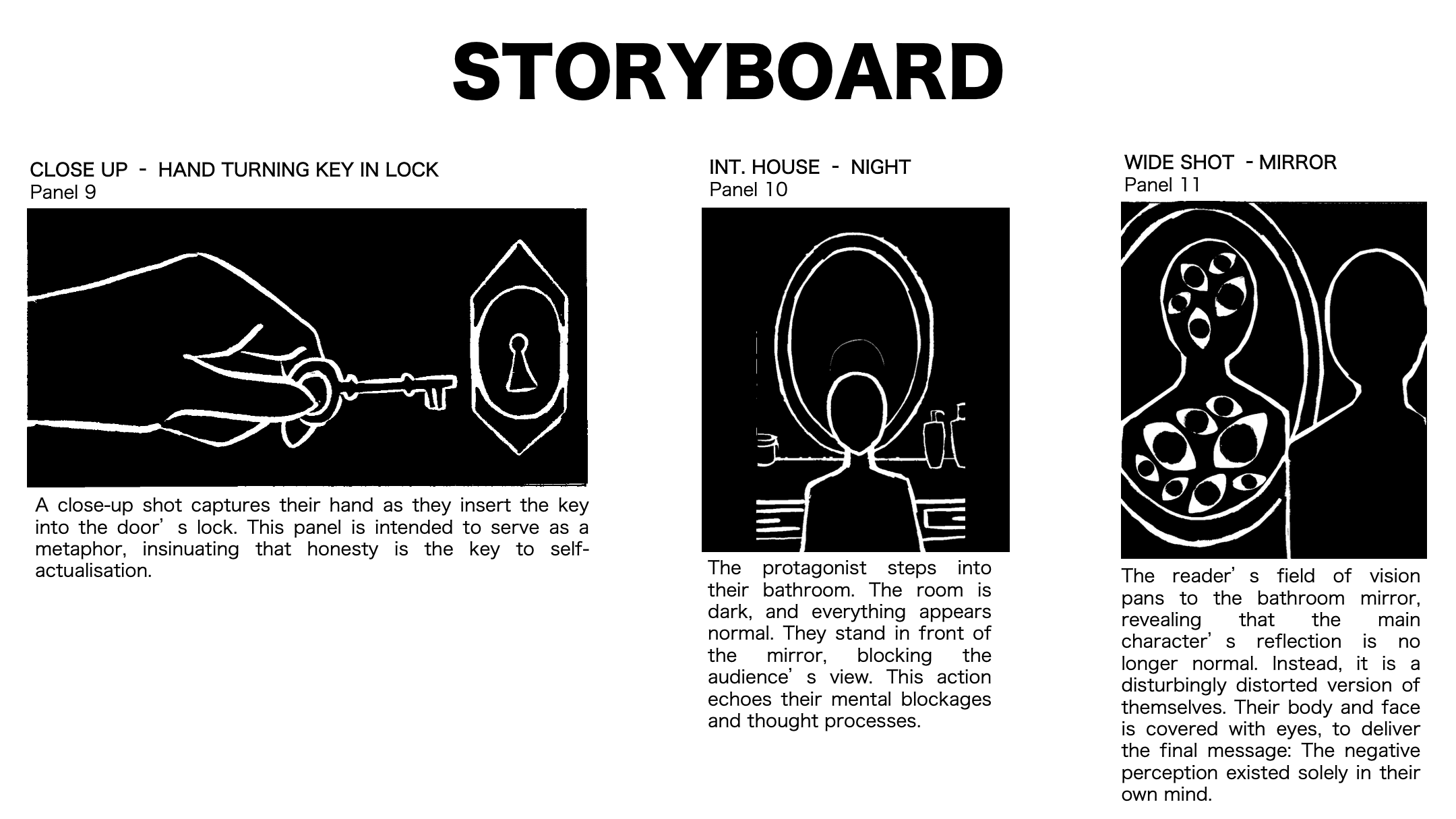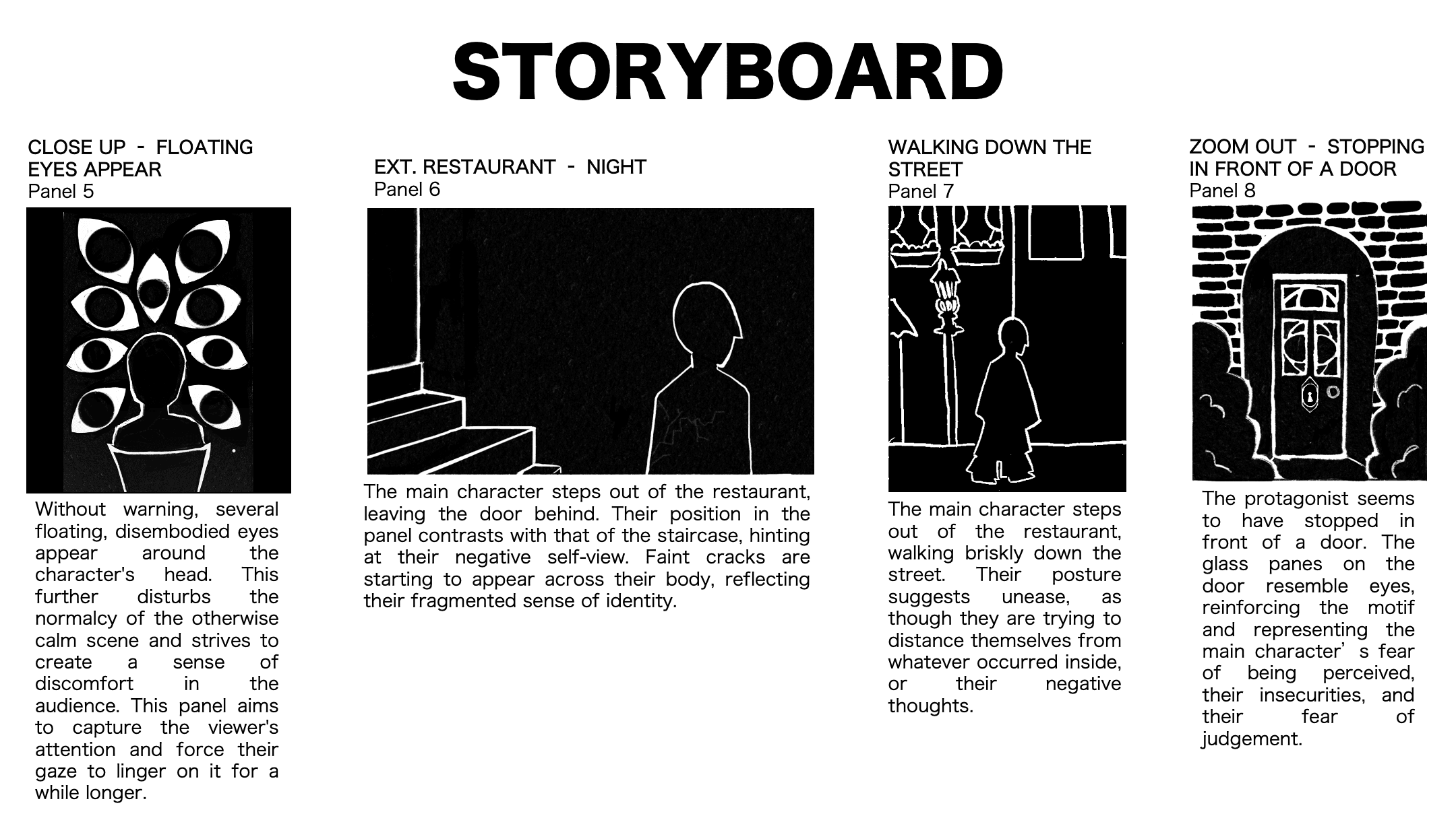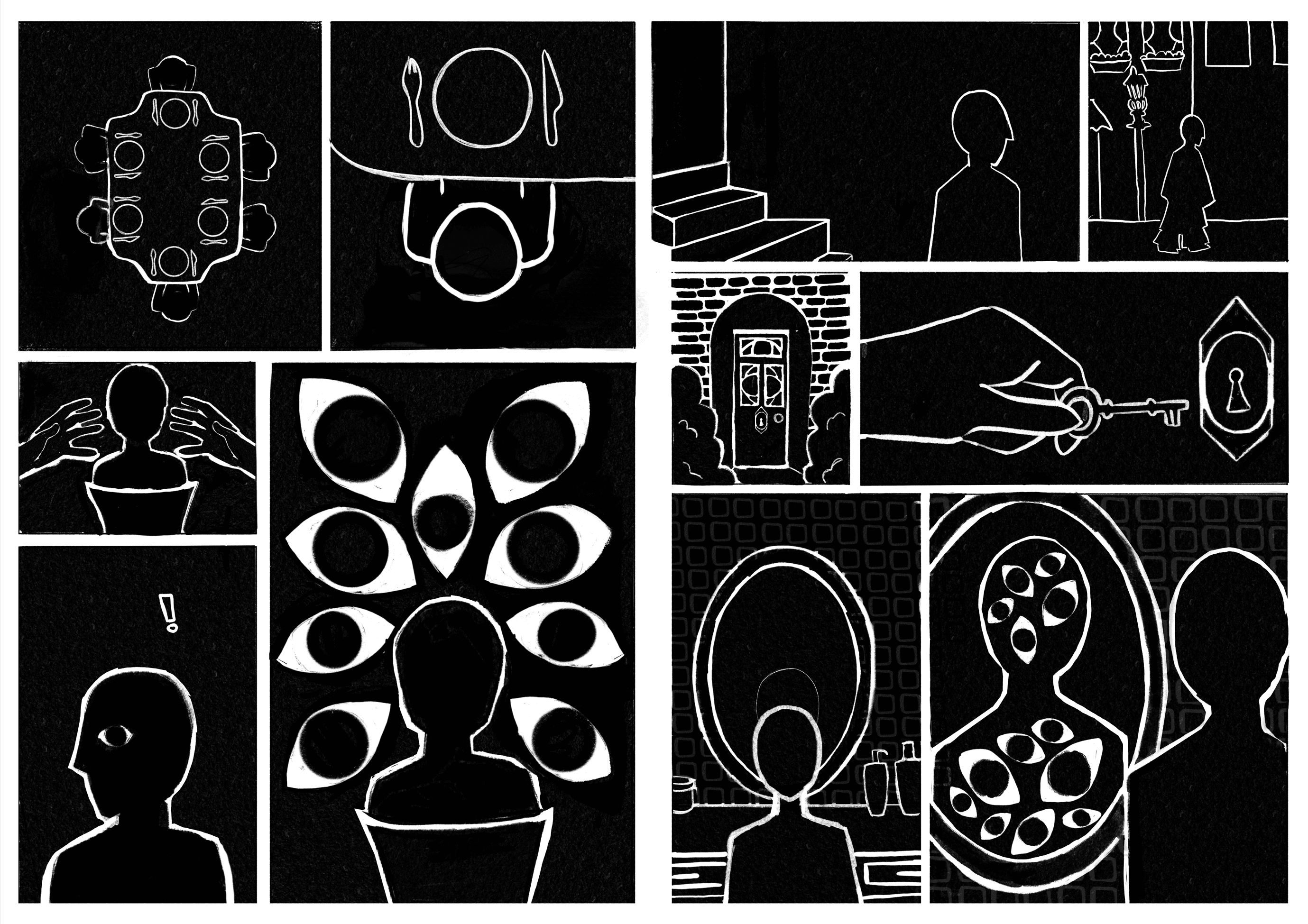 A digitally enhanced linoprint comic visualising anxiety and the fear of perception through an eerie, wordless narrative. The comic relies on its limited colour palette and imagery (fragmented reflections, cracks, discombobulated floating eyes) to symbolise the uncomfortably aware experience of social anxiety.