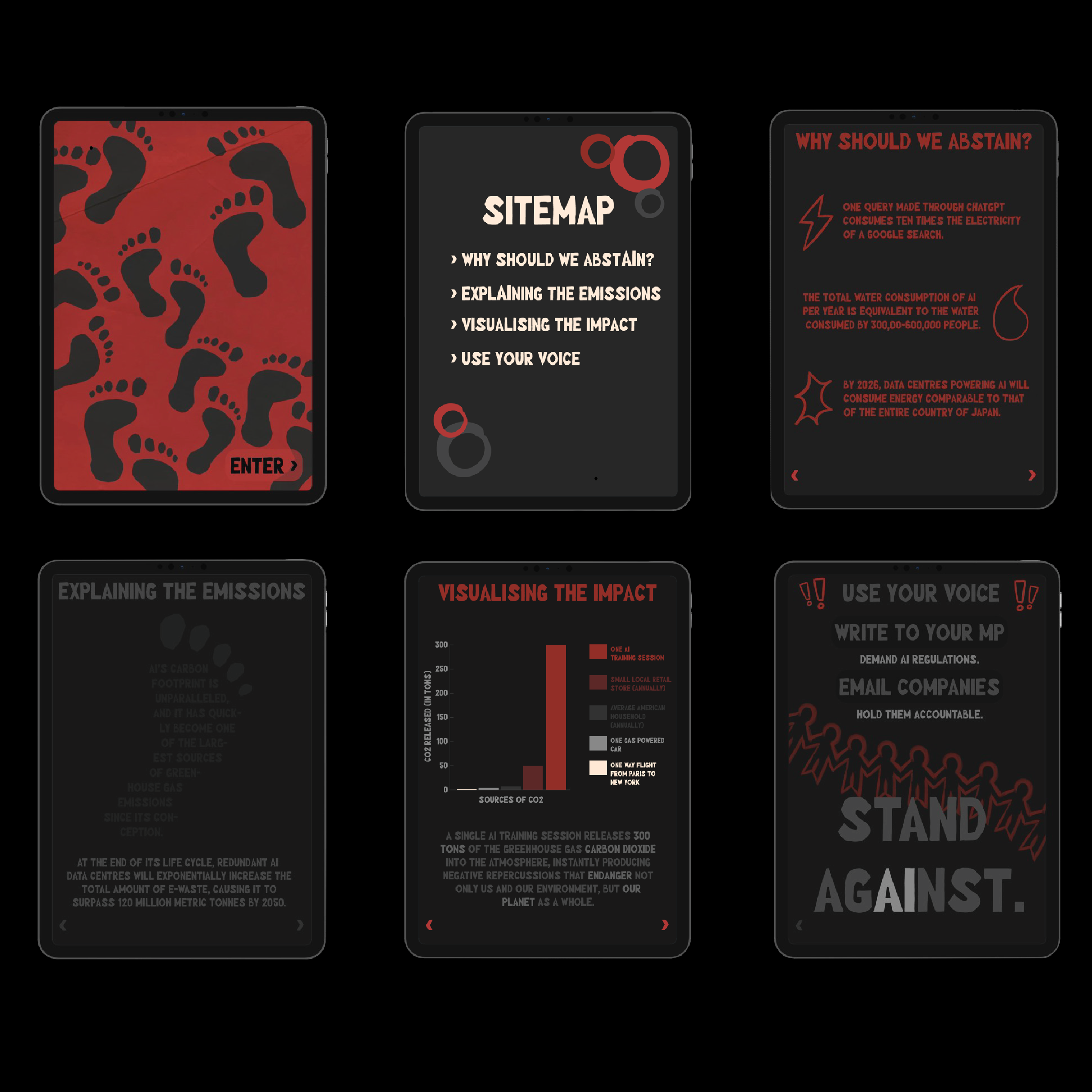 An app developed in Figma for the Woodland Trust, designed to raise awareness about environmental conservation by highlighting the ecological impact of unregulated artificial intelligence. Created as part of a university module on Social Design, the app features five interactive pages and one motion animation to engage users through visually-driven content.